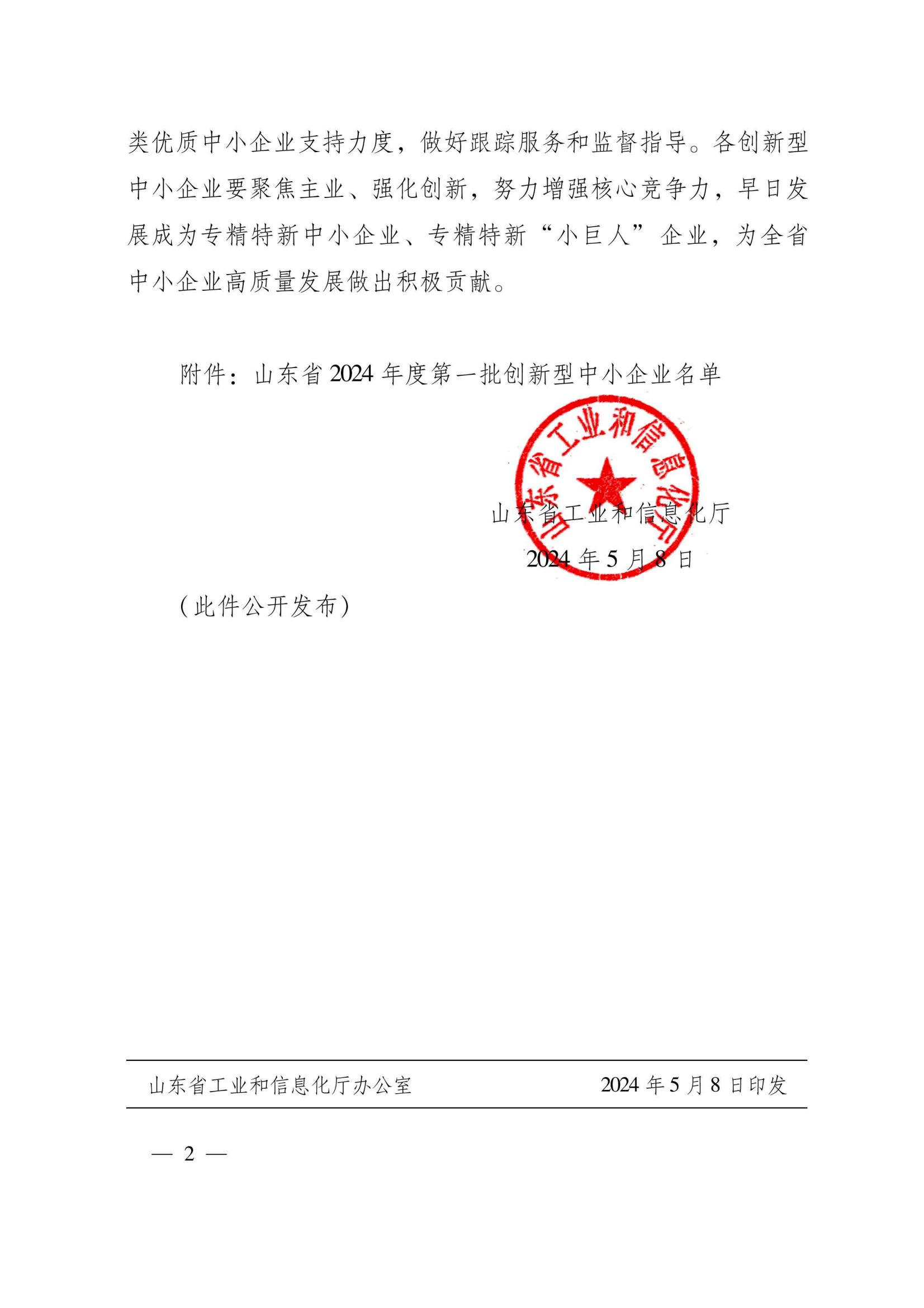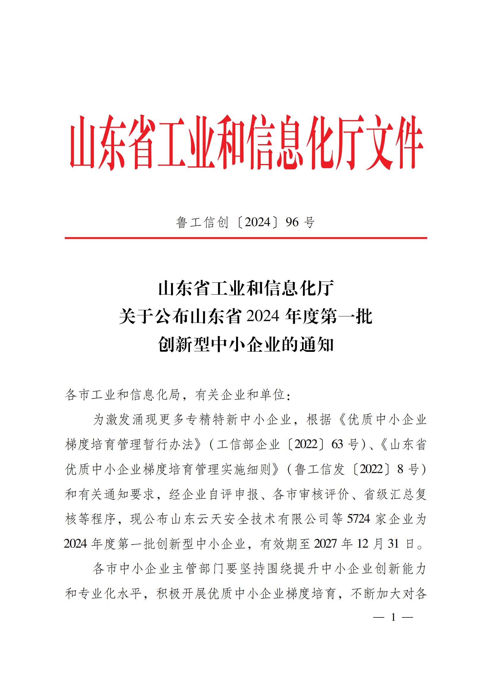 5月8日,山东省工业和信息化厅下发《关于公布山东省2024年度第一批创新型中小企业的通知》,我公司荣登榜单,认定为山东省2024年度第一批创新型中小企业。